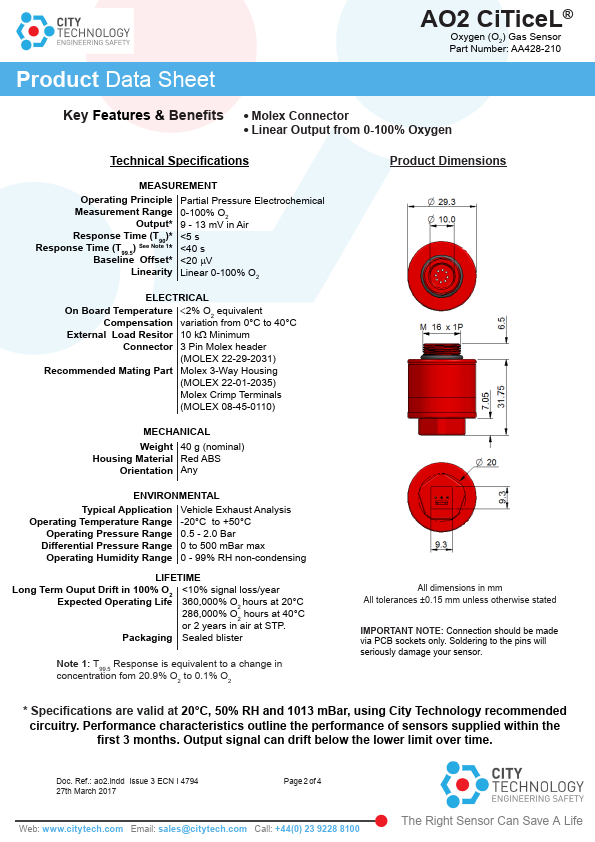 Oksijen sensörü orijinal ambalajında, genellikle azot gazı ile doldurulmuş sızdırmaz plastik ambalajda mühürlenmiş olarak saklanmalıdır. En uygun saklama sıcaklığı 0°C ile 20°C arasındadır. British CITY AO2 PTB - 18.10 oksijen sensörü, aşağıdakiler gibi her türlü oksijen test cihazıyla ilgili bilgi vermektedir: motorlu taşıt egzoz test cihazı; egzoz gazı çevre test cihazı; oksijen indeksi test cihazı.