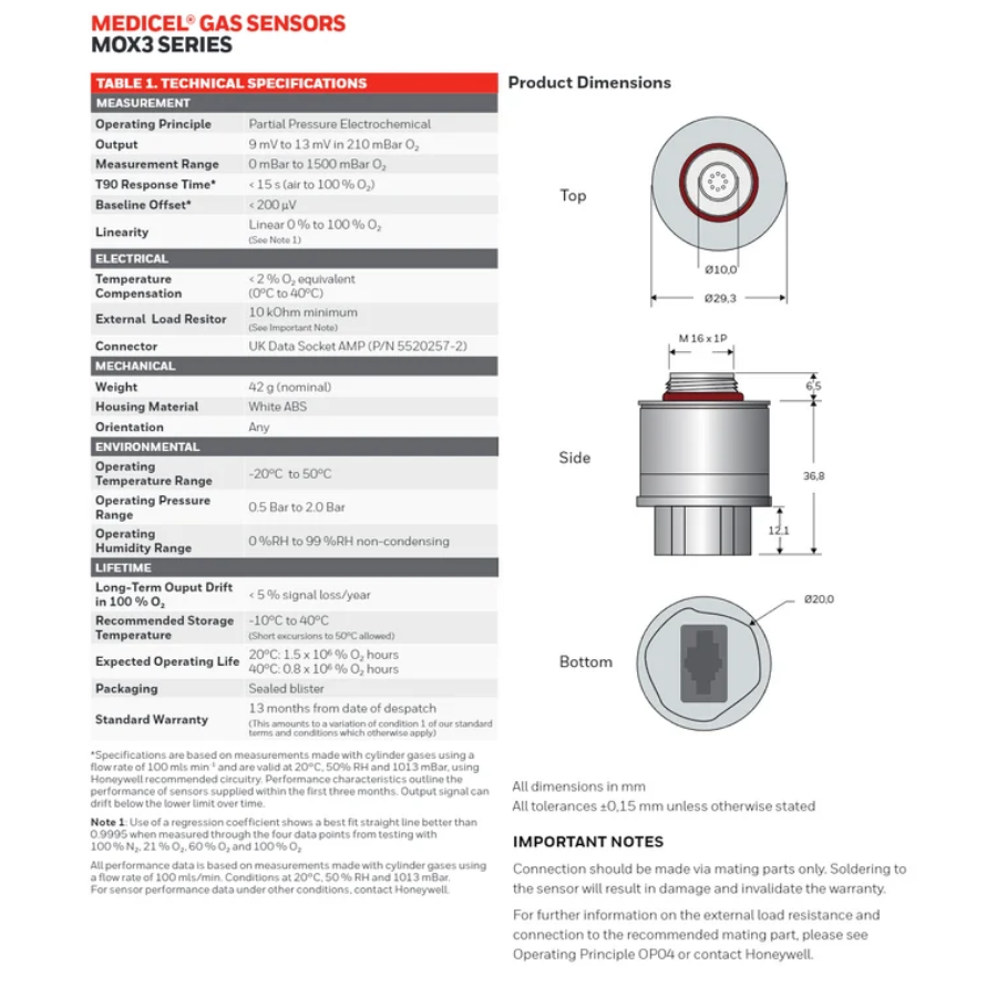 City Mox3 Oksijen Sensör Özellikleri;